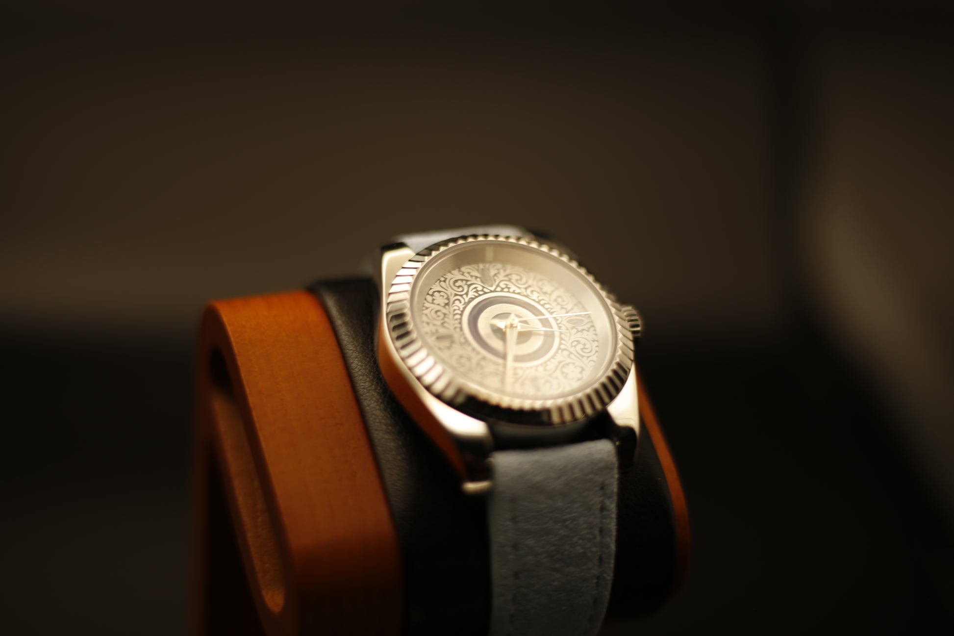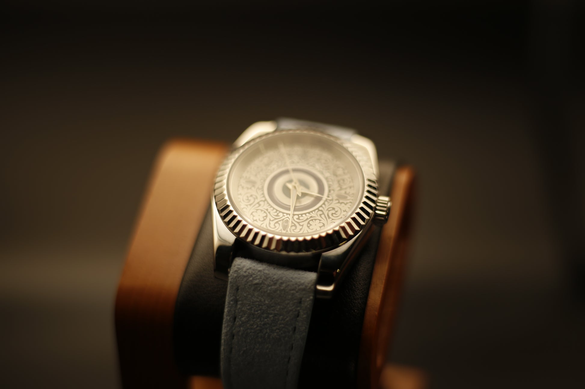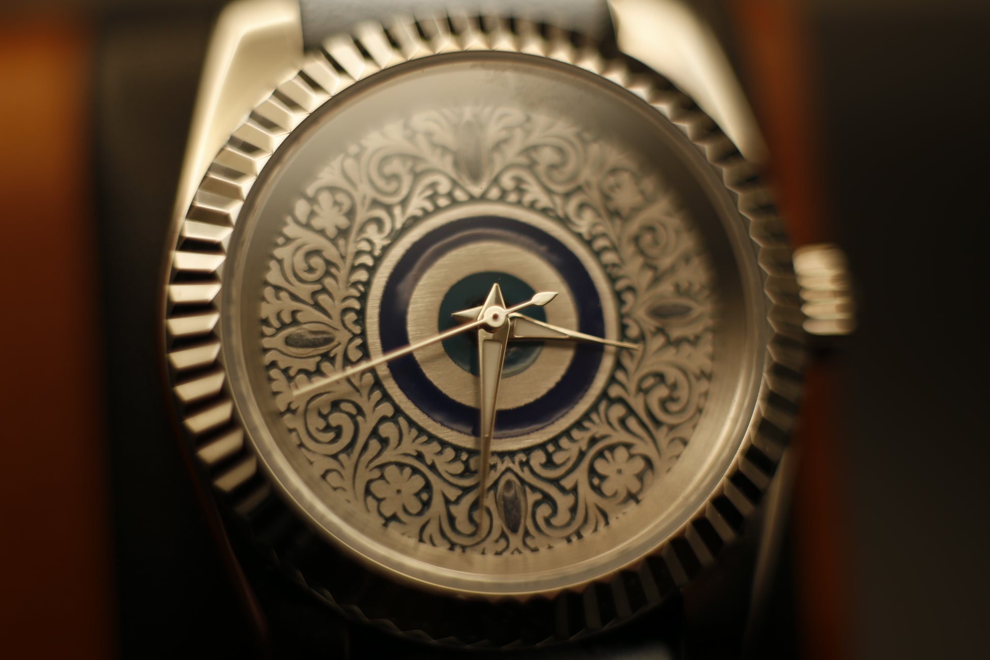 Grace meets mystique in this 41mm masterpiece. The dial features an intricate silver filigree design encircling a deep blue Evil Eye—an ancient symbol of protection and focus. Powered by the reliable Miyota 2039 quartz movement, it pairs artistry with precision. Finished with a soft blue strap and polished steel case, this timepiece embodies craftsmanship, culture, and quiet strength.